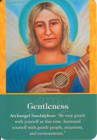 Sandalphon wishes to help you feel peaceful and centered, and he strongly advises that you begin by listening to gentle music. Play it wherever you go. Talk quietly and engage in slow, rhythmic movements such as swaying to music or a gentle yoga session.